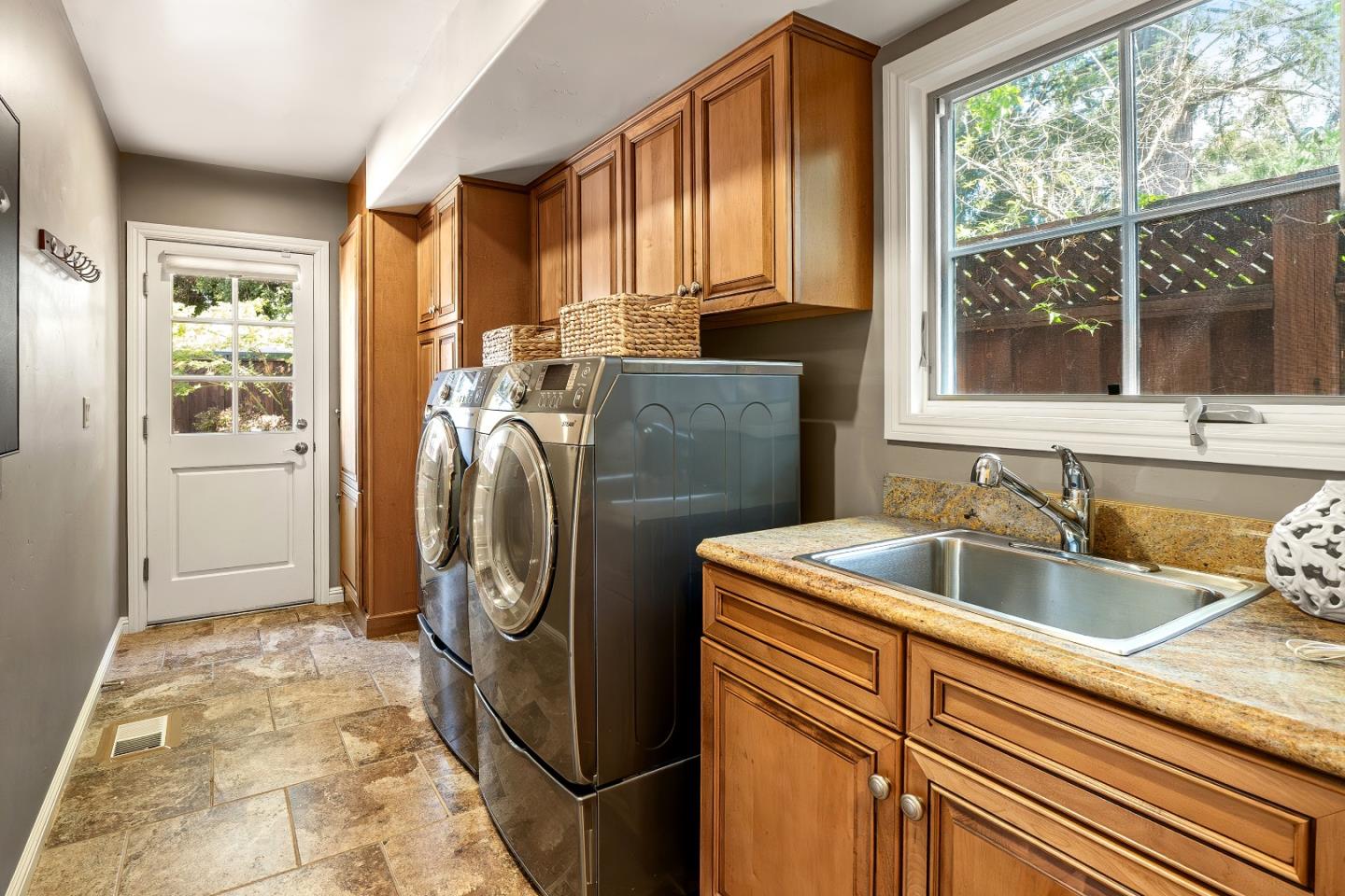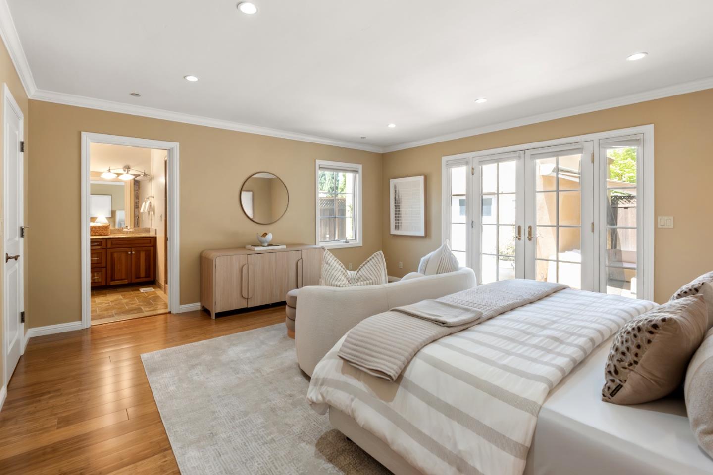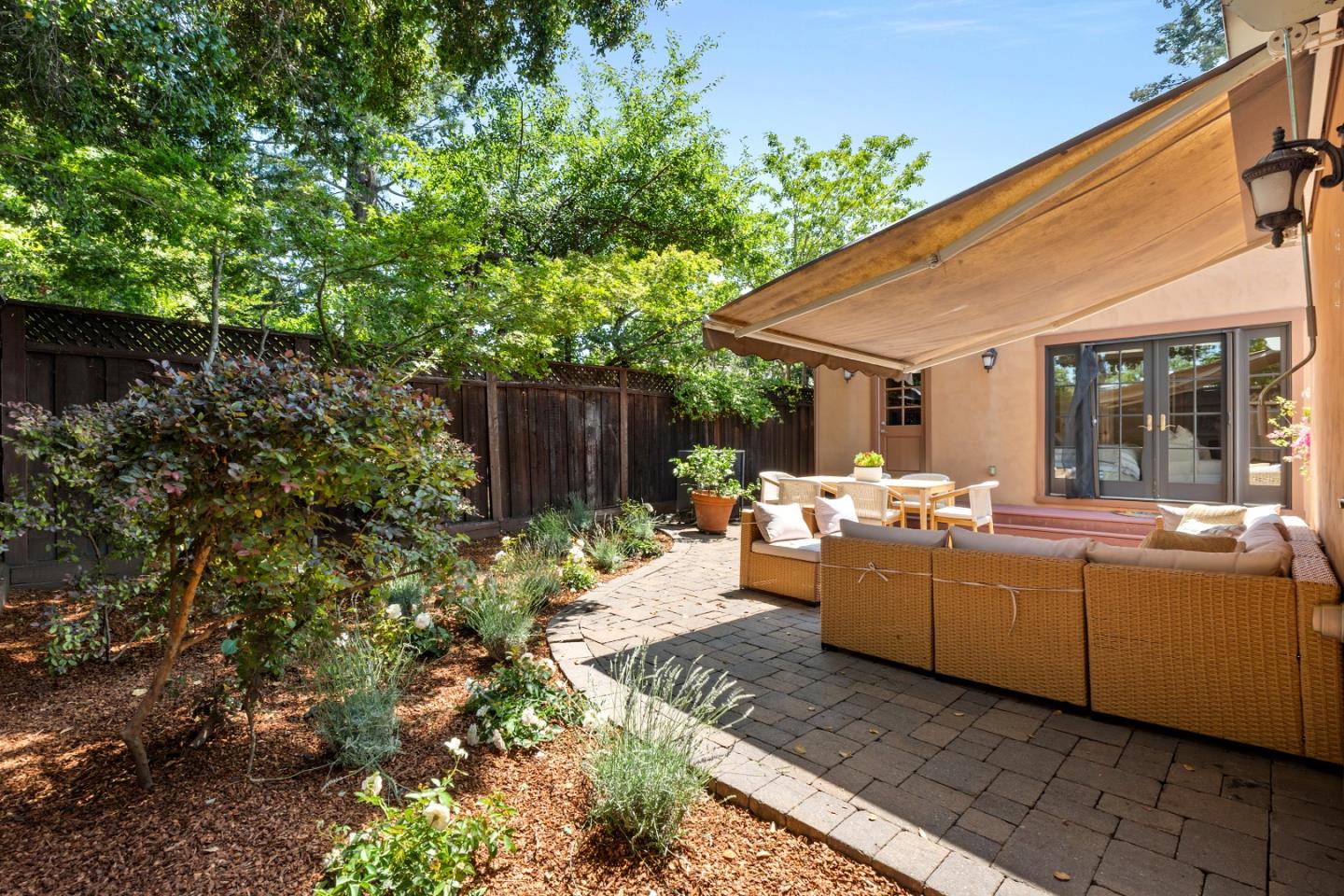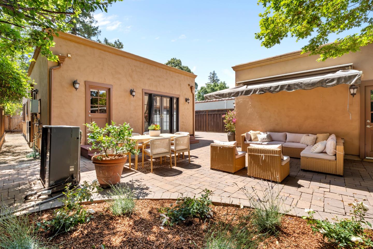 This charming single-story Spanish bungalow was completely rebuilt in 2009 and features 3 bedrooms and 2 baths, large open spaces and a great floor plan. The heart of the home is a spacious, open kitchen/family room. The kitchen features ample cabinetry, a large pantry, stone countertops, stainless steel KitchenAid appliances, and counter seating. The bedroom wing features 2 bedrooms, a large hall bath with 2 sinks and dual shower heads and a spacious primary suite, complete with a gorgeous bathroom and 2 custom-designed closets with built-ins. The mudroom with laundry area and a sink lead to the outside patio, which is just right with space to entertain and enjoy the garden. The detached 2-car garage has loads of built-in storage and a 220v EV outlet for EV charging. Beautiful wood floors, built-in closets throughout, owned solar panels, 2 Tesla batteries. Don't miss this wonderful, move-in ready home in Menlo Park