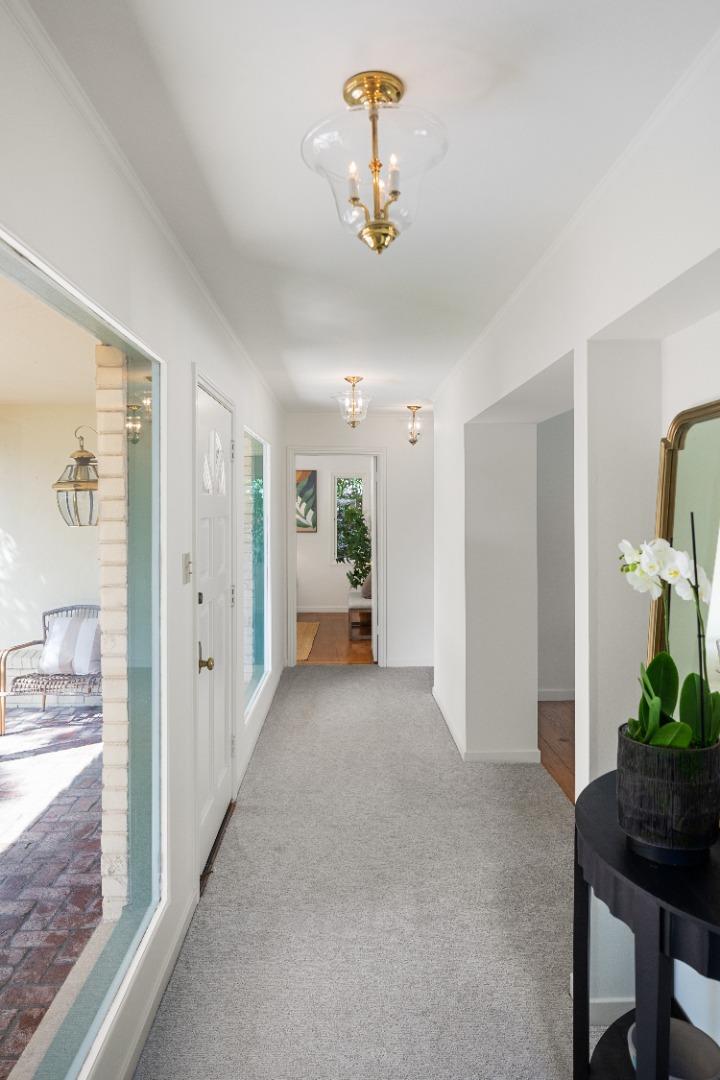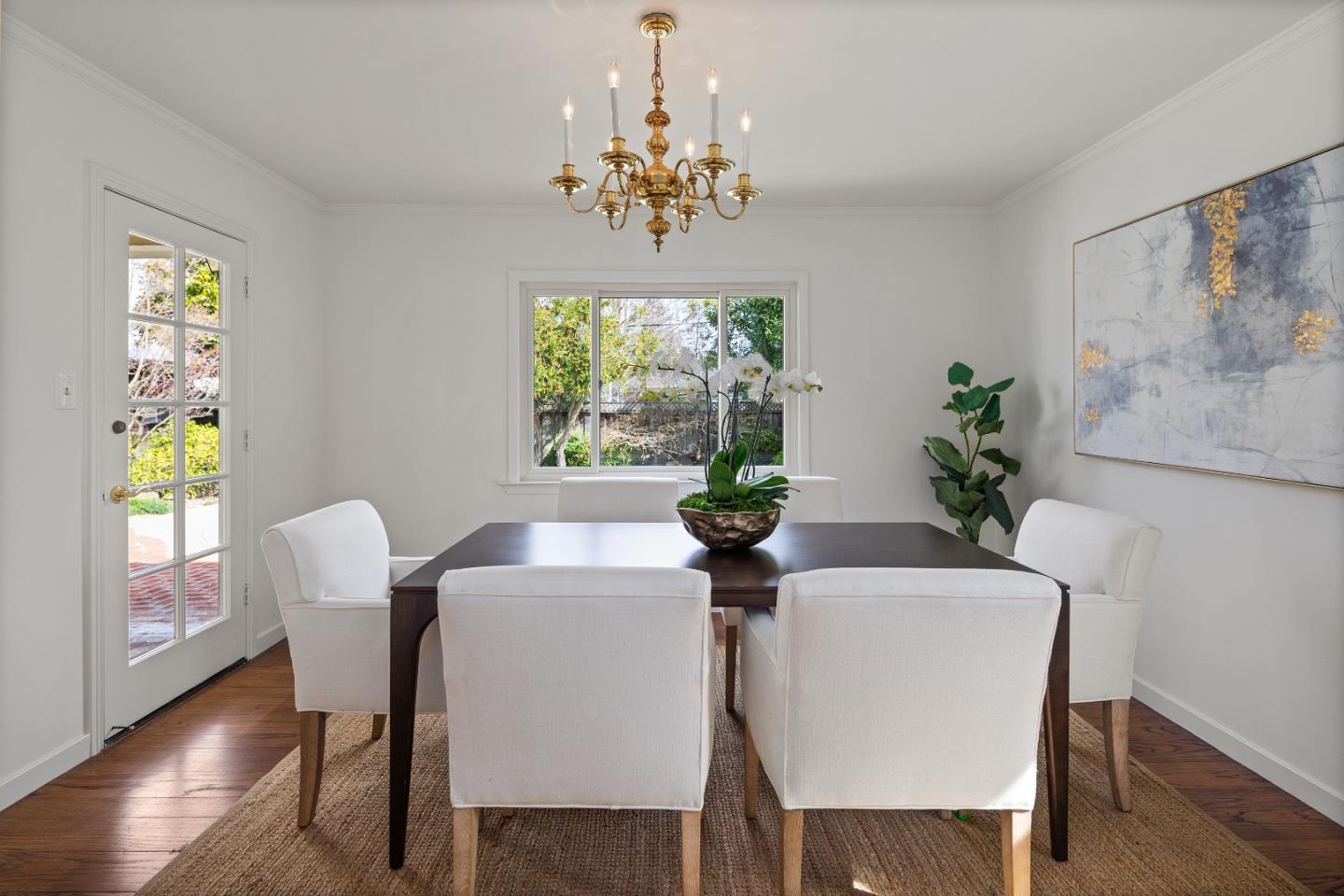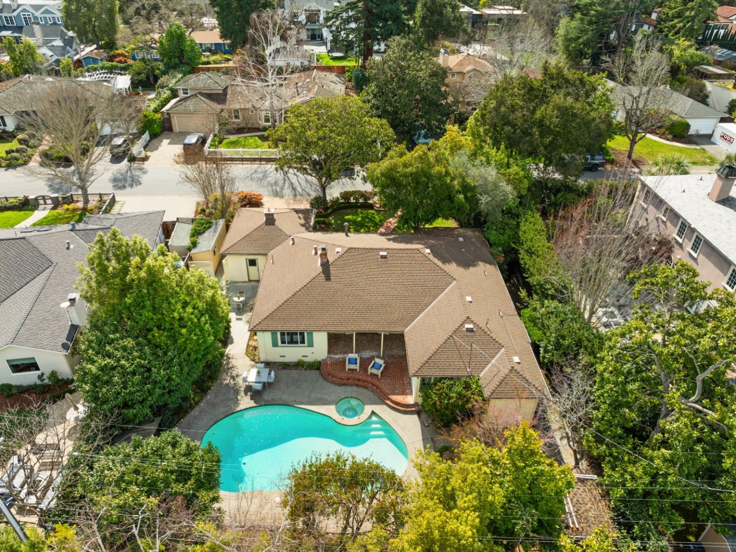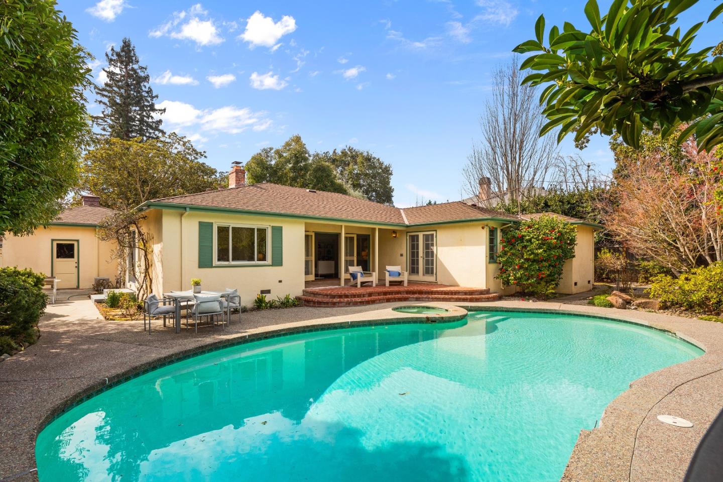 Prime Central Menlo Park! Charming property on serene and sought after tree-lined street. Classic home with wood floors, lovely floor to ceiling windows, formal dining room, pool and spa. The eat-in kitchen features sliding doors that open onto a side yard large enough for outdoor dining. Spacious rooms throughout including a primary suite with vanity and walk in closet. Multiple doors open onto the lovely, private backyard with pool. Two car garage with plenty of storage. This is a highly sought-after location - enjoy, remodel or build new. Award-winning Menlo Park schools.